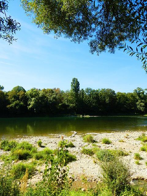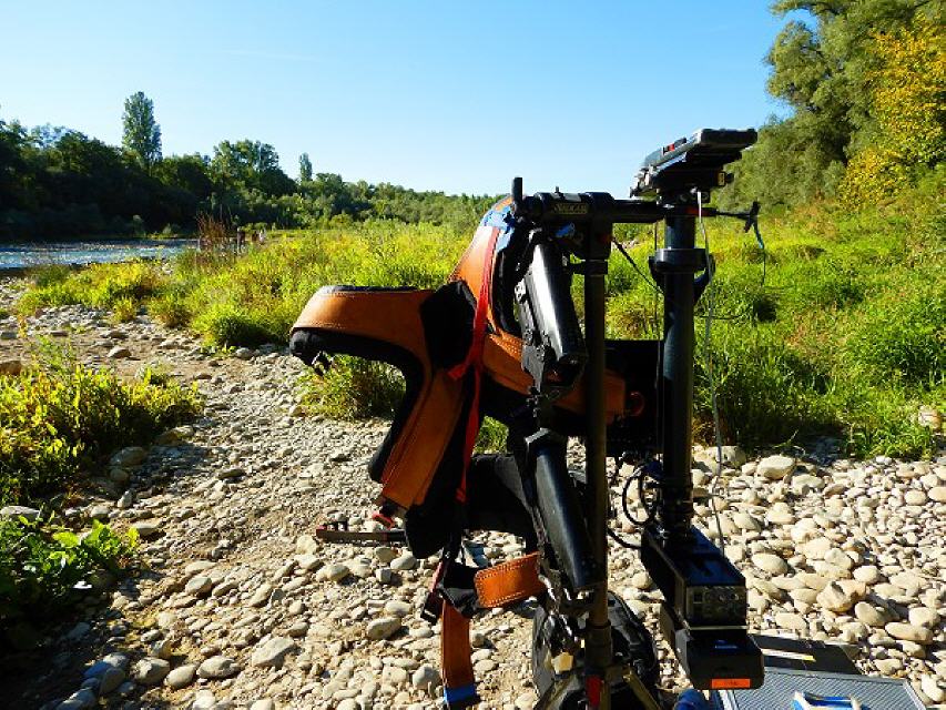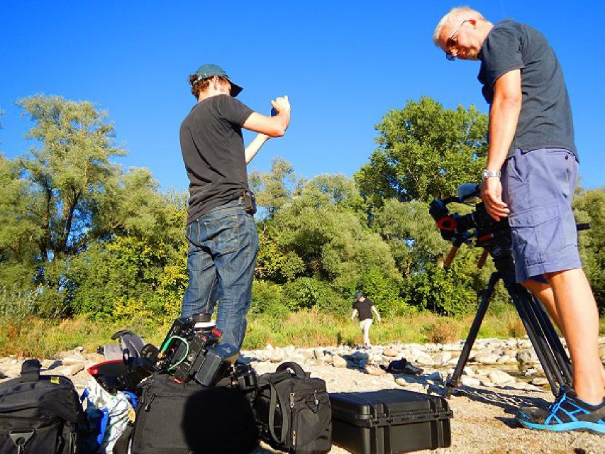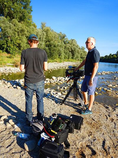 Die beiden TV-Fahrzeuge standen auf dem Rheindammweg oberhalb des Goldwaschplatzes. Jetzt ging es darum, mit meinem Werkzeug den “langen” Weg durch den Rheinwald zur Goldwaschbank abzulaufen. Das hört sich unspektakulär an, wenn man jedoch den Weg mehrmals und in voller Montur begehen soll, weil zwischendurch andere Kameraeinstellungen und -perspektiven vorgenommen werden, wird’s schweißtreibend. Nach einer gefühlten Stunde am Rheinufer angekommen, schweifte mein Blick auf den vor mir liegenden Rhein. Ich sollte den Anblick genießen – und nichts sagen. Jedenfalls zunächst. Dann durfte ich etwas sagen. Aber nur einen, höchstens zwei Sätze. Dabei hätte ich so viel zu sagen gehabt, hätte am liebsten drauf los geplappert.