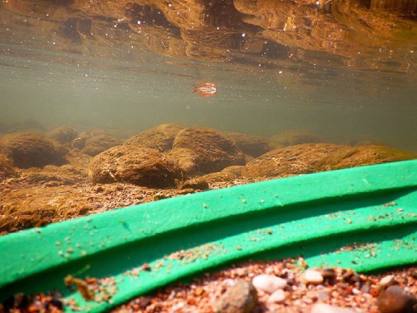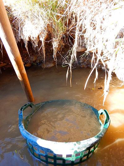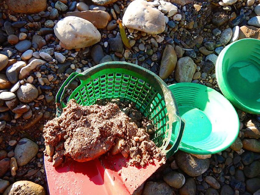 Und ich? Nach der Niete vor kurzem, als ich mit so wenigen Goldfunden “wie noch nie” nach Hause ging, wollte ich heute den “großen Fund” machen. Während ich mein spärliches Ergebnis mitleidig bewunderte, hatten zwei Kollegen direkt an der Wasserkante ein ziemlich tiefes Loch gegraben – und wurden fündig. Was sie herausholten, waren nicht die winzigen Stückchen wie bei mir, sondern größere Flitterchen. Heute waren diese Kollegen nicht da. Also setzte ich zum Versuch an, grub mich an ihrem Loch weiter in die Tiefe – und fand nichts. Nicht einmal den schwarzen Sand. Und damit war auch kein Gold da.
