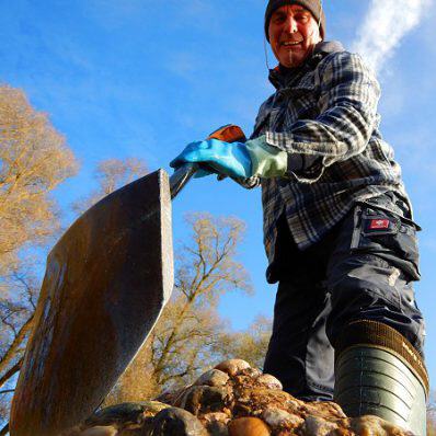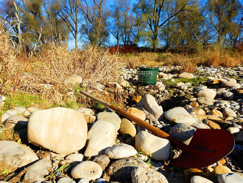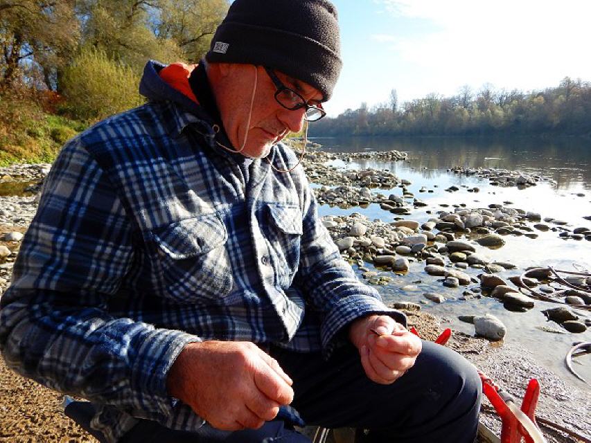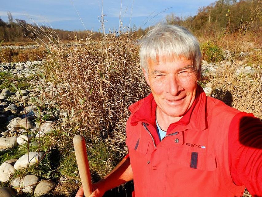 Goldsucher Hans kennt sich aus auf der Geröllbank bei Istein. Er bezeichnet die mehrere 100 Meter lange Kieselsteinanhäufung gerne als “Insel”. Dabei grenzt der Steinhaufen direkt an die Uferböschung.