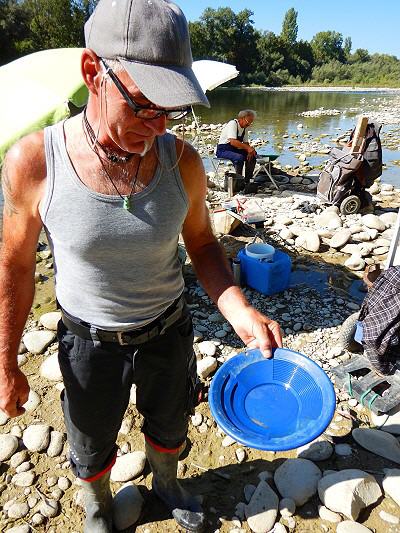 Flussaufwärts waren zwei weitere Goldsucher. Aus der Ferne sah einer verwegener als der andere aus. Fast so wie im Wilden Westen oder vom Klondike. Einer kam zu uns runter. Der Abenteurer mit dem Wildwesthut kam aus dem Elsass. Zum ersten Mal sei er hier auf der badischen Rheinseite, ansonsten buddle er drüben. Dort habe er die mehrere Meter breite und ziemlich lange Goldlinie abgegraben. Total. Der Lohn: ein paar Gramm Gold.