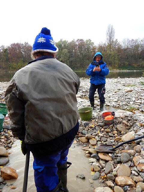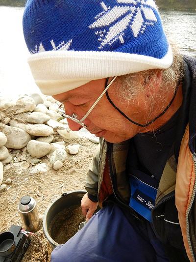 Eine Stunde vor Sonnenuntergang trafen zwei weitere Goldsucher ein. Sie kamen aus Lörrach, richteten sich direkt an der Wasserkante ein. Es ist dieselbe Stelle, an der ich mehrfach ziemlich erfolglos den Sand durchsiebte. Aber im Gegensatz zu mir gruben sie gut einen halben Meter tief. Ihr Einsatz sollte sich lohnen: Bereits in der ersten Pfanne zählten sie etwa ein halbes Dutzend größere Flitter.