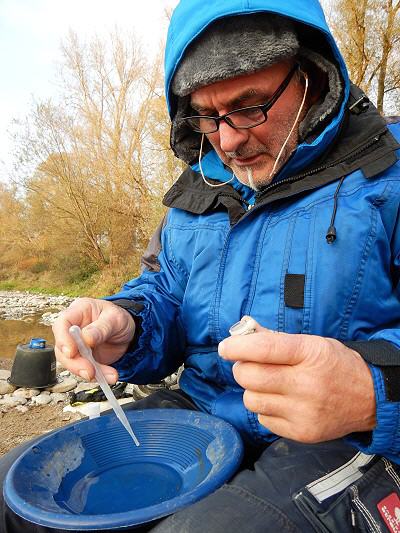 Tim ist Neuling in der Goldwäschergemeinschaft und ebenfalls vom Goldvirus infiziert. Er setzt eine kleine, handliche Rinne ein. Hingegen nutzen Hans und Wolfgang selbst gebaute und sehr schmale Schleusen, die sogar die winzigsten Goldflitterchen zurückhalten. Allen drei gemeinsam ist die Sorgsamkeit, mit denen sie den Sand vorsieben.