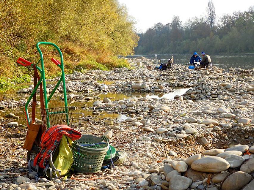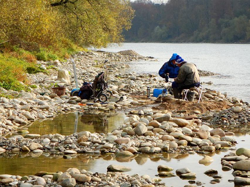 Der Goldwaschplatz, auf dem wir nach dem schönsten aller Metalle schürften, liegt beim Rheinkilometer 179, etwa auf halber Strecke zwischen dem Isteiner Klotz und den Schwellen. Er ist einer der beliebtesten Waschplätze am Oberrhein. Hier trifft man (fast) immer Goldsucher an.