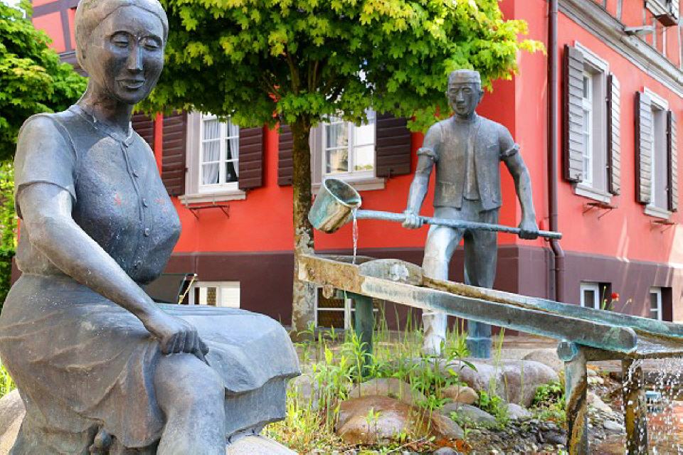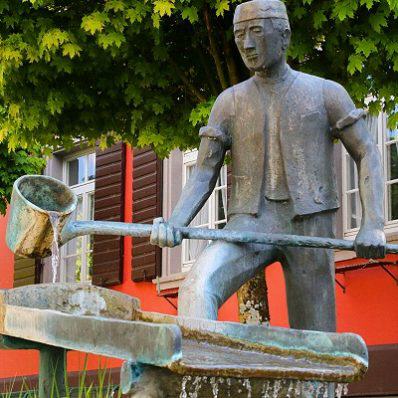 Goldwäscherdenkmal in Goldscheuer. Es befindet sich zwischen dem Rathaus und dem alten Schulhaus.