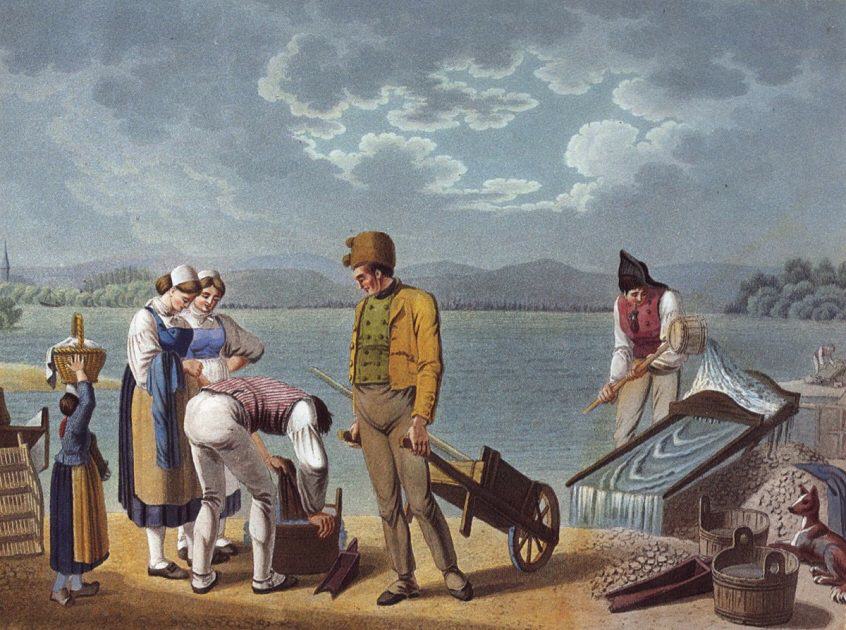 Die Szene stammt keineswegs aus dem „goldenen Westen“ Amerikas. Der gefürchtete Goldrausch bleibt aus. Allemal an Wochenenden und dann nur in den frühen Morgenstunden oder an regnerischen Tagen und wenn der Wasserstand niedrig ist, gehen immer mehr Menschen einem Freizeitspaß nach: der Goldwäscherei. Namen wie Goldscheuer bei Kehl in der Ortenau erinnern an jene wenig glanzvolle Vergangenheit.