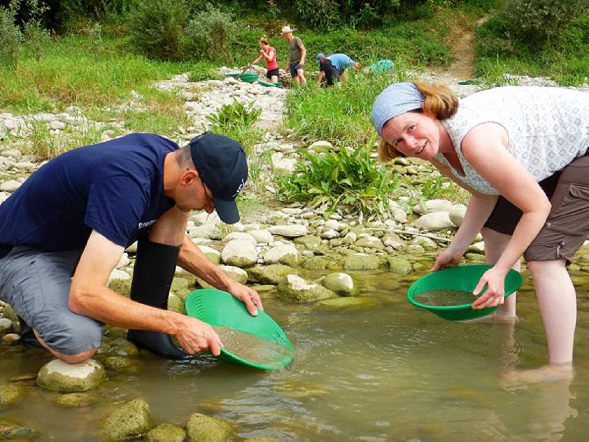 Ansonsten verlief der Tag so spannend wie üblich. Zunächst brachen wir von Bad Bellingen aus zum südlich des Kurortes gelegenen Goldwaschplatz auf, bezogen unser “Basislager” und gingen nach einer kurzen Einleitung sofort ans Werk.