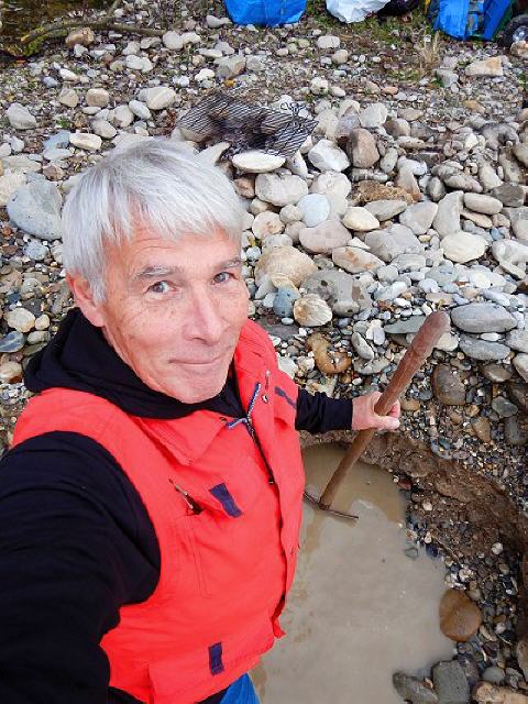 Schön auch, dass alle Teilnehmer mit Begeisterung an die Sache rangingen. Als Grabungsplatz hatte ich mich für eine Stelle entschieden, die ich vorige Woche bereits erfolgreich getestet hatte. Es konnte also auch nichts schief gehen. Und tatsächlich, in fast allen Pfannen zeigten sich Goldkrümmel. Den merkwürdigsten Beifund machte übrigens Hans aus Konstanz: Er fand eine uralte Patronenhülse…