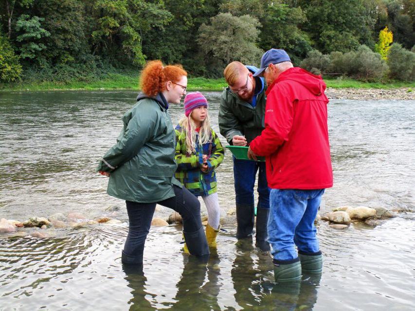 Pünktlich holten wir beim Treffpunkt in Bad Bellingen die Goldwasch-Teilnehmer ab und führten sie zum Goldwaschplatz. Die Kiesbank war wie gewohnt fast komplett trocken. Schon bald mussten wir sogar unsere Regenbekleidung ablegen. Im weiteren Verlauf sollte kein einziger Regentropfen fallen, dafür gab’s einmal sogar für einige Minuten richtigen Sonnenschein. Was für ein Tag!