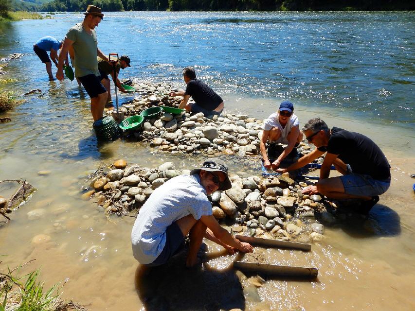 Im Gegensatz zu anderen Goldwaschplätzen hat das Hochwasser die Geröllbank hier "verdreht", so dass selbst in tiefen Schichten eine dicke Lehmschicht liegt. Die jetzt tieferen Schichten waren ursprünglich oben. Das ist ungewöhnlich. Die Teilnehmer dieses Waschkurses bekamen dies durch einen ungewöhnlich hohen Anteil an Lehm zu spüren. Aber dieser Lehm enthält auch Gold, was mit dem letztjährigen Hochwasser darin angereichert wurde.