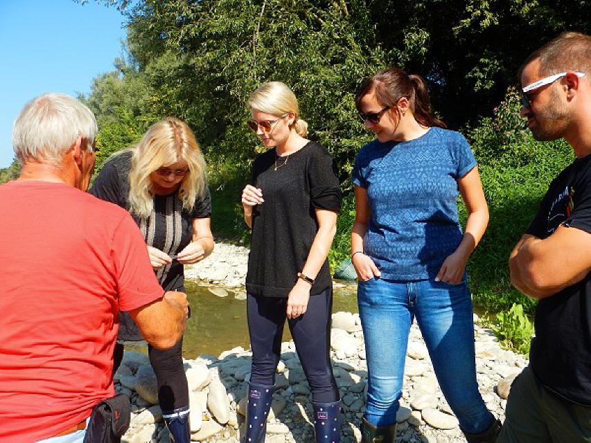 Schon bei der Begrüßung spürten Steffi und ich die Freude der Teilnehmer über den bevorstehenden Sonnentag. Am Goldwaschplatz angekommen waren die Erwartungen riesig. Unter den schattenspendenden Blätterdach unmittelbar am Ufer gab ich zunächst ein paar einführende Erklärungen, während die freudigen Gesichter die einzigartige Uferlandschaft bestaunten.