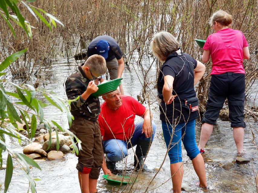 Die Teilnehmer waren mit Eifer bei der Sache, schaufelten die oberen Sand- und Geröllschichten frei, um an den begehrten, goldhaltigen Sand zu gelangen. Dieser musste lediglich reingewaschen werden. Was sich so einfach anhört, gestaltet sich in der Praxis dann doch etwas komplizierter. Denn es erfordert ein wenig Übung, den richtigen Dreh herauszubekommen, bis endlich nur noch die schweren Sande in der Pfanne verbleiben, während die leichten über den Pfannenrand fortgespült sind. Abschließend genügt ein leichter Schwenk, bis der darunter liegende "schwarze Sand" (Magnetit) auf dem Pfannenboden haften bleibt. Mit etwas Glück tauchen darin Goldflitterchen auf. Manchmal sind es sogar mehrere.