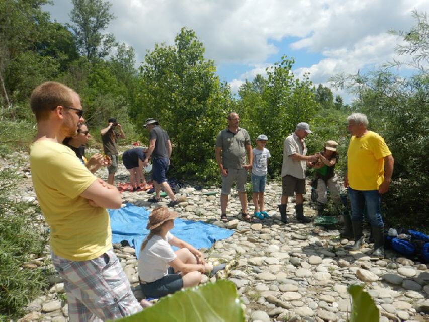 Zugegeben, dem einen oder anderen Teilnehmer war es ein wenig mulmig, als wir vom beschatteten Waldparkplatz zum Rheinuferweg liefen und vor uns die Isteiner Schwellen lagen. Das Hochwasser drängte sich zwischen den Felsspalten und über kleinere Inseln, verschlang kleine Baum- und Buschgruppen. Ich konnte die Teilnehmer beruhigen: Der Goldwaschplatz liegt ein paar hundert Meter unterhalb auf einer weiten Kiesbank; dort hat sich der Fluss wieder beruhigt.