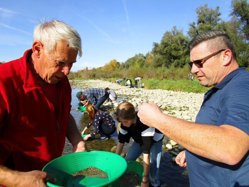 Alle waren pünktlich am Ausgangspunkt in Bad Bellingen eingetroffen, deshalb konnte die Fahrt zum Waldparkplatz beim Goldwaschplatz ziemlich zügig erfolgen. Dort angekommen, rannten die Mehrzahl der Abenteurer sofort auf die riesige Geröllbank. Dort unten, unmittelbar an der Wasserkante zeigten Steffi und ich, worauf man beim erfolgreichen Goldwaschen achten sollte und wie die Waschpfanne zu handhaben ist. Schon früh fanden sich auch die ersten Goldflitterchen ein. Was für ein Anblick! Das Gold glänzte im Licht der Oktobersonne besonders schön.