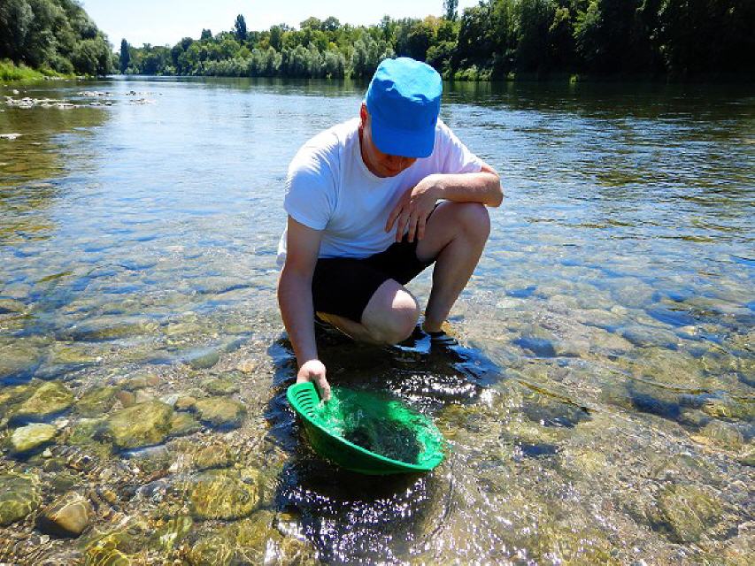 Und dann waren natürlich die praktischen Übungen. Gold ist ein extrem schweres Edelmetall. Entsprechend eigenwillig verhält es sich im Geschiebe, versteckt sich gerne in den tieferen Sedimenten und lässt sich nur mit einigen Tricks aus dem Sand gewinnen. Dazu zählt als erstes, die obersten Kieselsteine vom Flussgrund entfernen, bis man auf eine feste, verdichtete Schicht stößt. Sie zu durchbrechen erfordert ziemlich viel Muskelkraft.